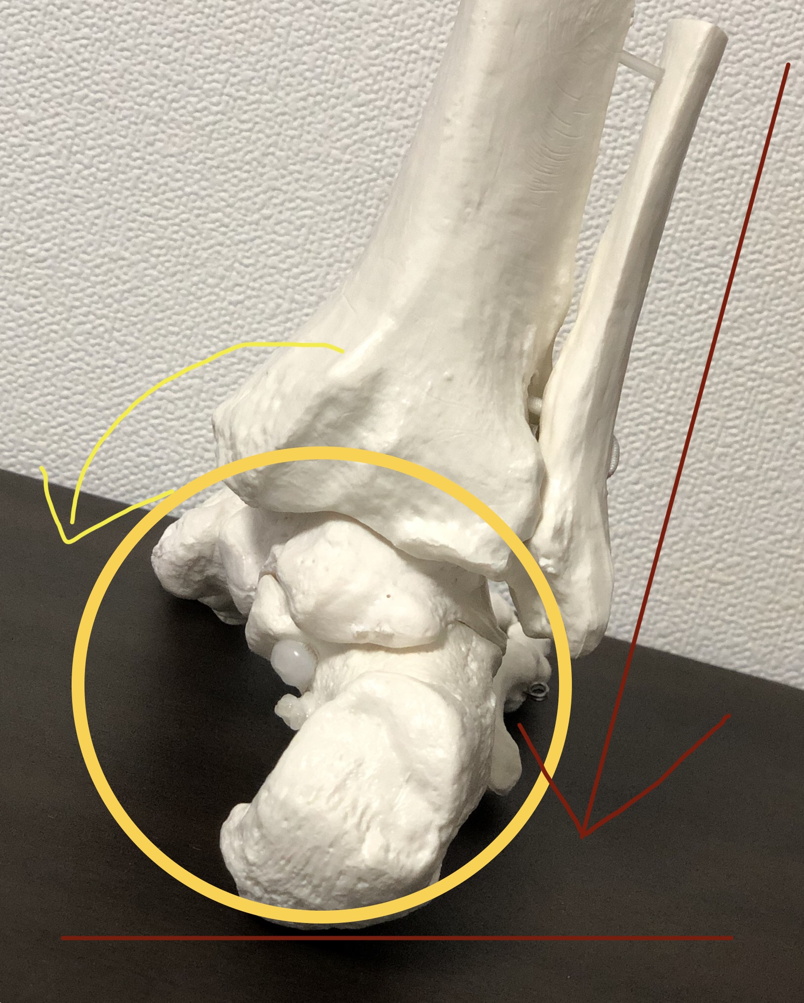 ■外側から内側への傾斜は➡小指側を上げて親指側を下げるもので、偏平足への誘導にないります。足の骨はX脚と同じ状況になります。(下記の写真の状況です)