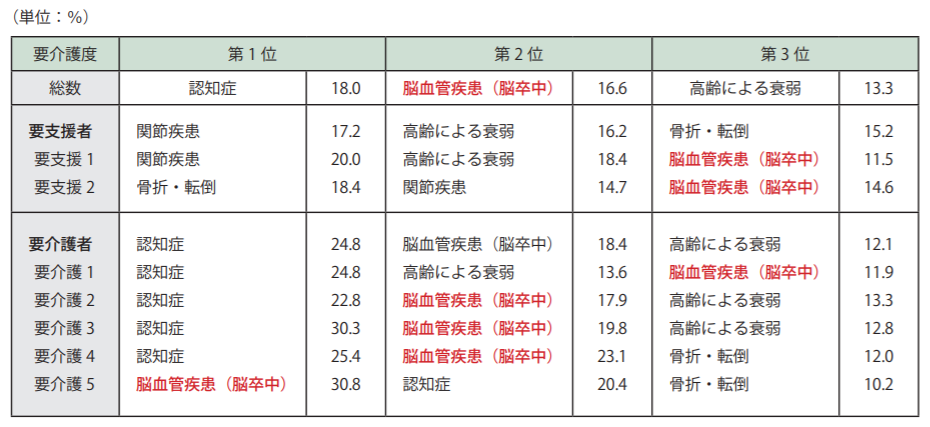 全国的にみても、脳卒中は要介護度別にみた介護が必要となった主な原因 第2位になります。