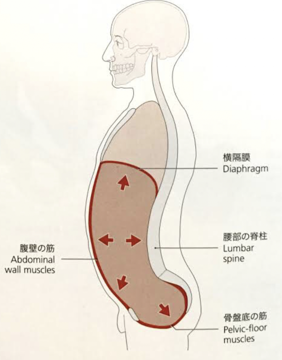 あなたの体を見てみましょう。肋骨から骨盤までの間は、背骨以外には骨は何もないですよね。しかしその中には、内臓がたくさん入っています。その内臓の動きを守るのも腹腔内圧です。そして、腰の骨の役割を支えているのもこの腹腔内圧になります。