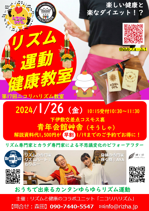 輝く羽のブログ 第17回 リズムと運動で健康教室 2023.11.24 こんにちは、輝く羽の西です。 2024年1月26日金曜日 下伊敷交差点コスモス裏の【青年会館艸舎】にて開催されます。 ジャズドラマー森田孝一郎のリズムと、体の専門家西綾の解説での運動です。 『体が楽になったと』ご好評いただいています 年明けのダイエット効果・認知症予防や転倒予防のための知識もありますよ。 是非ご参加ください Tweet Share Hatena Pocket RSS feedly Pin it この記事のタイトルとURLをコピーする イベント, 運動教室 産後のうつ 前の記事 足のアーチ 次の記事
